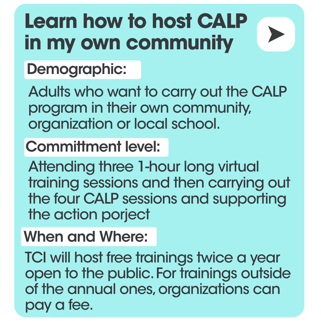 The Climate Action Leadership Program (CALP) is The Climate Initiative’s youth flagship program. By signing up for this program, participants learn about climate problems, solutions, and carry out a climate action project of their choosing!