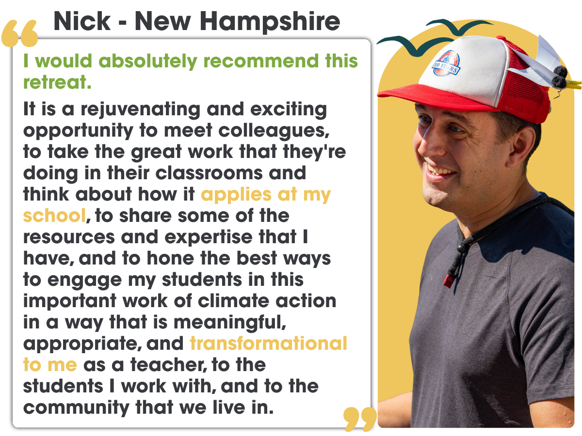 TCI Climate Educators Retreats are professional development opportunities, designed to support high school classroom teachers in incorporating climate education in their curriculum to educate, empower, and inspire students and community members to take action to adapt to or to mitigate climate change.